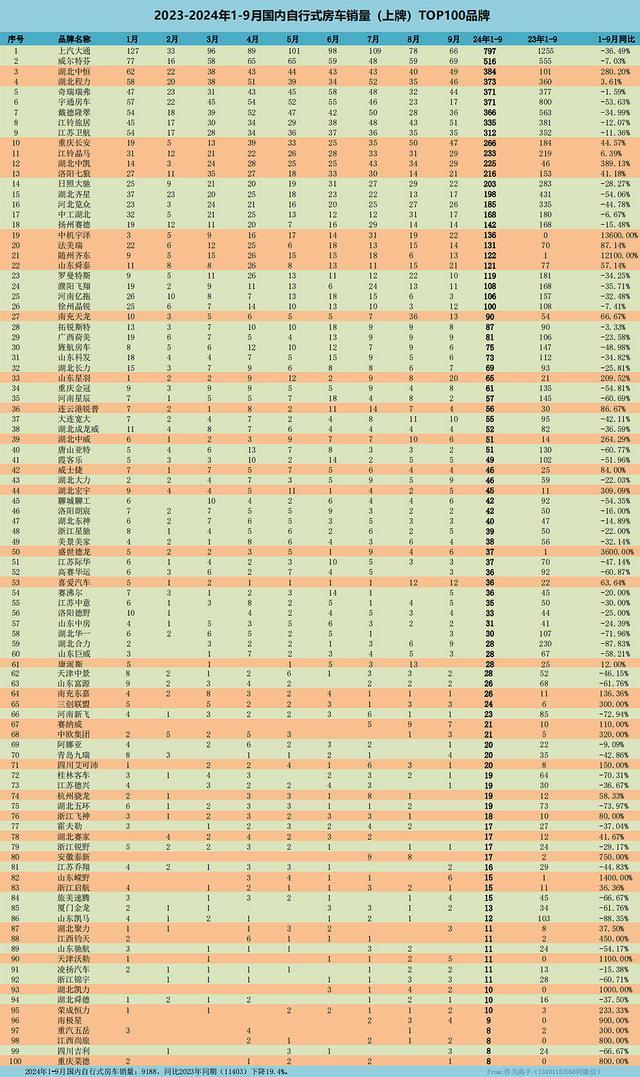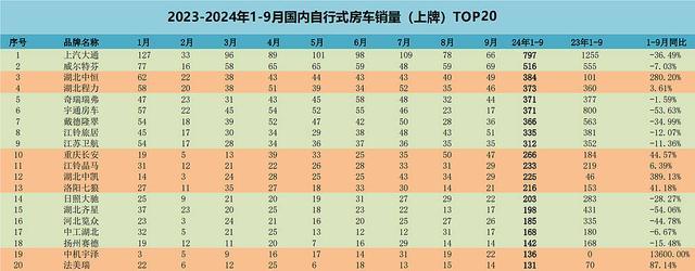 2024年1-9月国内自行式房车销量(上牌)TOP20品牌分辩为上汽大通、威尔特芬、湖北中恒、湖北程力、奇瑞瑞弗、宇通房车、感恩隆翠、江铃旅居、江苏卫航、重庆长安、江铃晶马、湖北中凯、洛阳七狼、日照大驰、湖北王人星、河北览众、中工湖北、扬州赛德、中机宇泽、法好意思瑞。