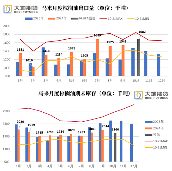 从目下机构预测产量数据看,马来10月的产量出现了昭彰的地差异化,西马环比减幅在-10~-6之间、砂拉越环比减幅在-7~-3之间,而沙巴地区则大幅增产7~12%之间。举座预期产量在178-180万吨傍边。同期,环比10%的出口增幅下,瞻望10月的期末库存在186万吨傍边。