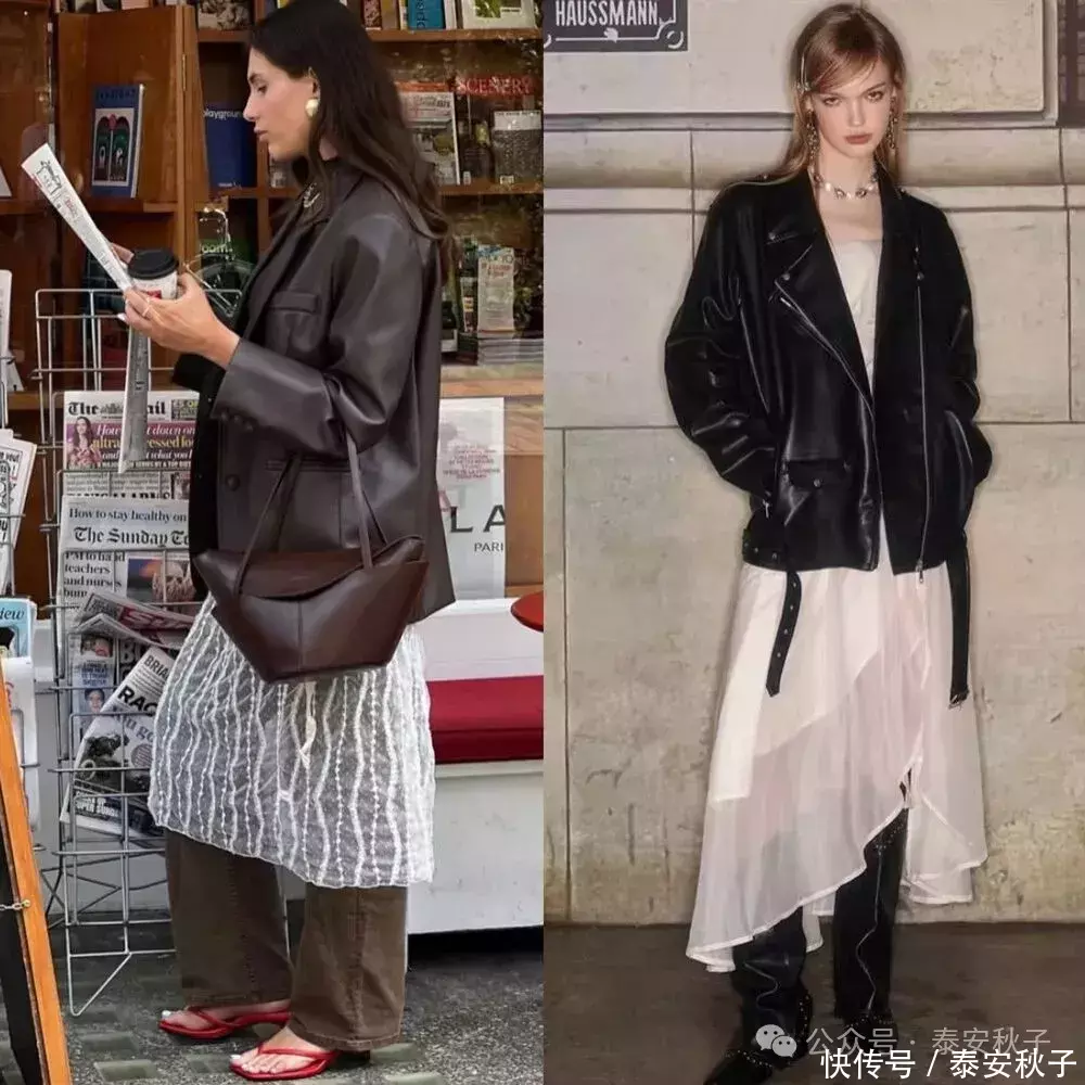 淌若你思用“皮衣+阔腿裤”的组合,来冲破秋末里的千里闷与陌生感,最简便的顺次即是用撞色系的裙子进行叠穿:比如在深棕色皮西装+同色阔腿裤的中间,叠穿一条白色的透视长裙,这种反差大一些的豪情荟萃,不仅能让档次感变得会愈加了了,还“激活”出一种很超逸的嗅觉,变得更芳华前卫了。