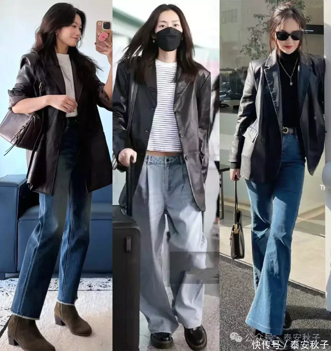 尤其是这种漂后耐看,又带着守旧摩登腔调的皮质西装,更是她们通勤穿搭中的首选。