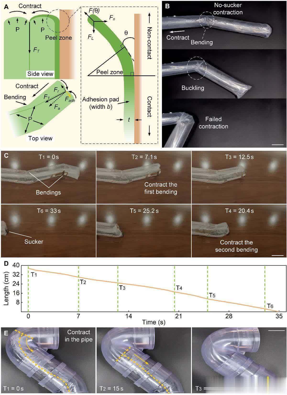为了科罚这个问题,机器东说念主应用了和墙面的吸附力。它身上的微结构生物膜产生的吸附力能对消径向力,让机器东说念主收缩时保持褂讪。