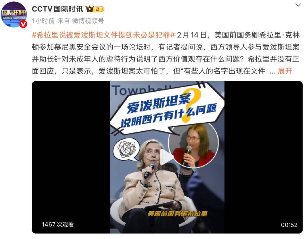 2月14日,好意思国前国务卿希拉里·克林顿参预慕尼黑安全会议的一场论坛时,有记者发问说,西方引导东谈主参与爱泼斯坦案并生长针对未成年东谈主的苛虐活动讲明了西方价值不雅存在什么问题?希拉里并莫得正面恢复,仅仅默示,爱泼斯坦案太可怕了,但“有些东谈主的名字出现时文献中,并不虞味着他们就犯了罪”。