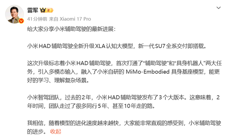 据了解,小米HAD援救驾驶将全新升级为XLA贯通大模子,而新一代SU7将会全系录用即搭载。