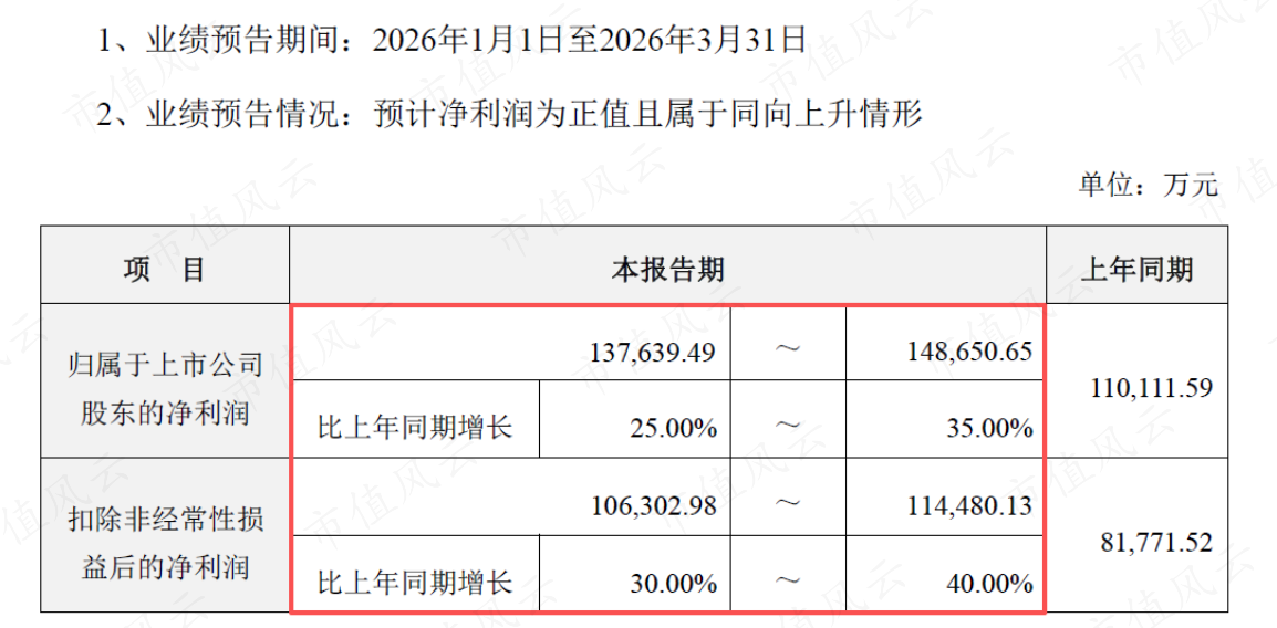 此外,2026年一季度,利润不绝上修,预测归母净利润13.8亿至14.9亿,同比增长25%至35%;扣非净利润10.6亿至11.4亿元,同比增长30%至40%。
