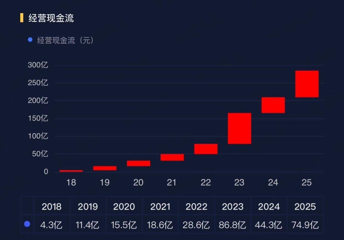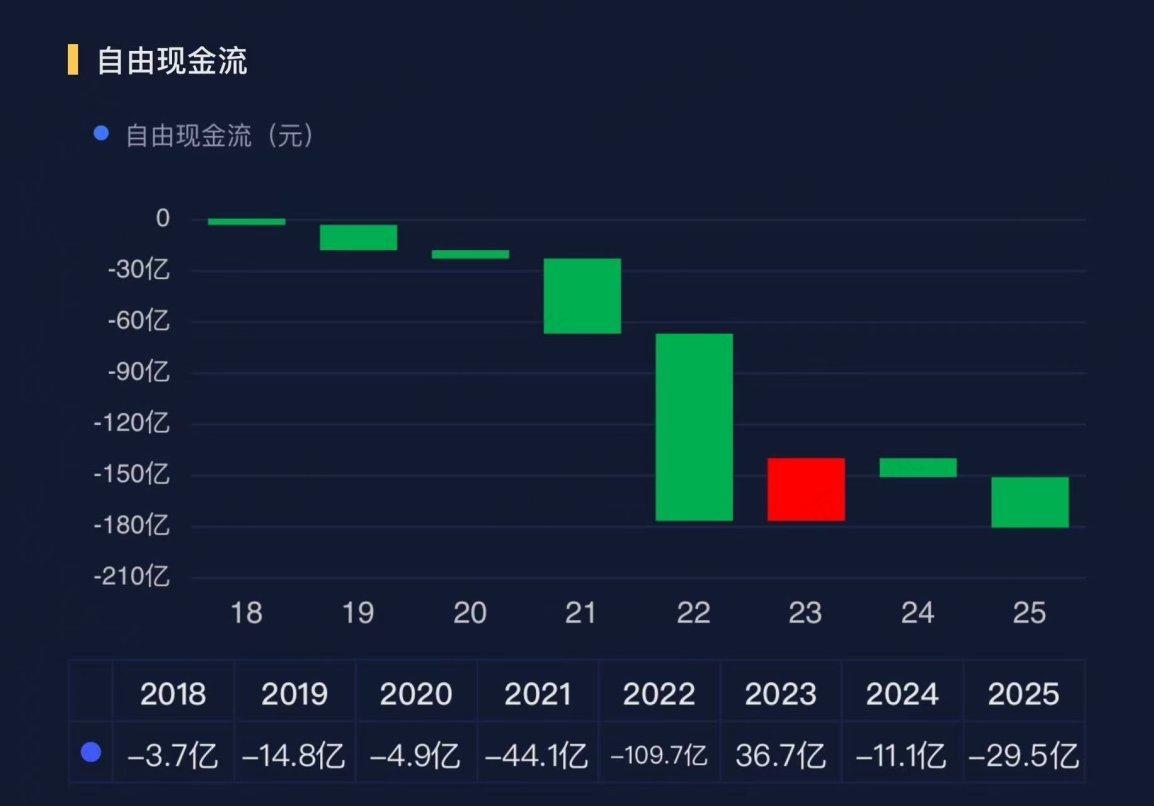 现款流就没那么乐不雅了。2025年,亿纬锂能筹画举止现款流净额74.92亿元,同比增长68.98%。但成本开支更大,解放现款流终年为负。